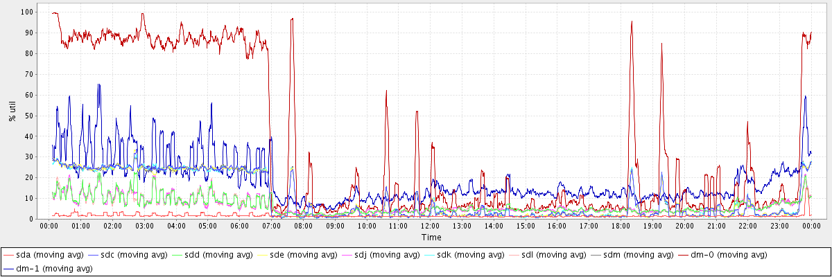 avg(sda) = 1.62 avg(sdc) = 9.79 avg(sdd) = 6.42 avg(sde) = 9.73 avg(sdj) = 6.34 avg(sdk) = 9.74 avg(sdl) = 6.31 avg(sdm) = 9.65 avg(dm-0) = 34.85 avg(dm-1) = 18.60