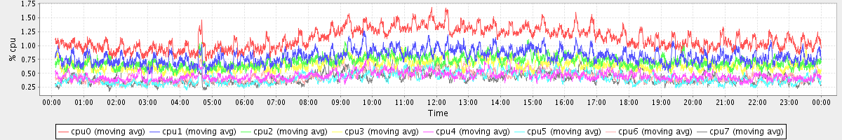 avg(cpu0) = 1.12 avg(cpu1) = 0.81 avg(cpu2) = 0.71 avg(cpu3) = 0.65 avg(cpu4) = 0.46 avg(cpu5) = 0.41 avg(cpu6) = 0.44 avg(cpu7) = 0.42