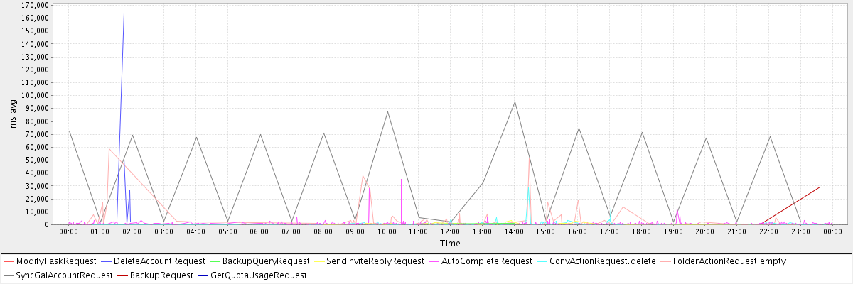 avg(ModifyTaskRequest) = 732.00 avg(DeleteAccountRequest) = 41481.00 avg(BackupQueryRequest) = 607.25 avg(SendInviteReplyRequest) = 720.71 avg(AutoCompleteRequest) = 703.24 avg(ConvActionRequest.delete) = 838.90 avg(FolderActionRequest.empty) = 3883.62 avg(SyncGalAccountRequest) = 36814.71 avg(BackupRequest) = 14681.00 avg(GetQuotaUsageRequest) = 1224.00