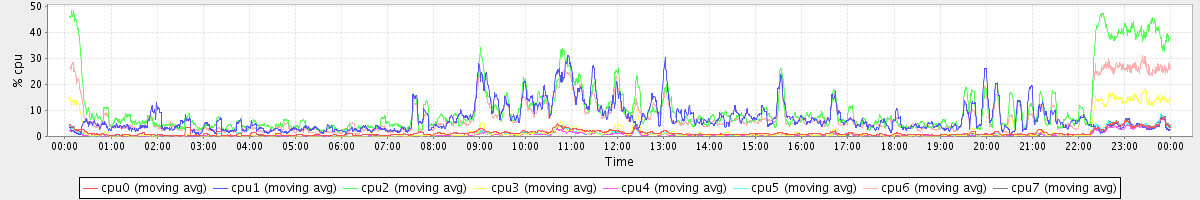 avg(cpu0) = 22.64 avg(cpu1) = 11.40 avg(cpu2) = 12.17 avg(cpu3) = 10.66 avg(cpu4) = 8.62 avg(cpu5) = 10.74 avg(cpu6) = 10.72 avg(cpu7) = 11.10