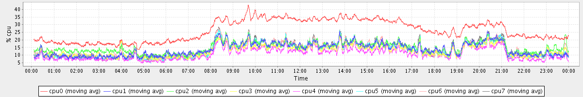 avg(cpu0) = 26.11 avg(cpu1) = 13.73 avg(cpu2) = 14.96 avg(cpu3) = 12.85 avg(cpu4) = 10.88 avg(cpu5) = 13.24 avg(cpu6) = 13.83 avg(cpu7) = 13.63