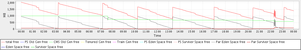 avg(total free) = 1328.27 avg(PS Old Gen free) = 0.00 avg(CMS Old Gen free) = 782.39 avg(Tenured Gen free) = 0.00 avg(Train Gen free) = 0.00 avg(PS Eden Space free) = 0.00 avg(PS Survivor Space free) = 0.00 avg(Par Eden Space free) = 499.01 avg(Par Survivor Space free) = 46.87 avg(Eden Space free) = 0.00 avg(Survivor Space free) = 0.00