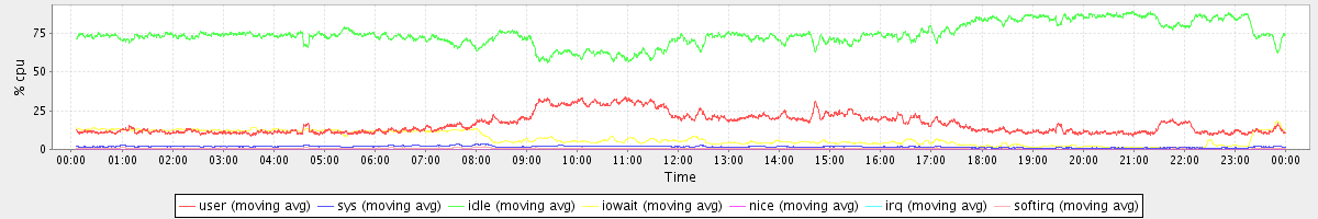 avg(user) = 16.31 avg(sys) = 1.68 avg(idle) = 74.31 avg(iowait) = 7.03 avg(nice) = 0.00 avg(irq) = 0.08 avg(softirq) = 0.59