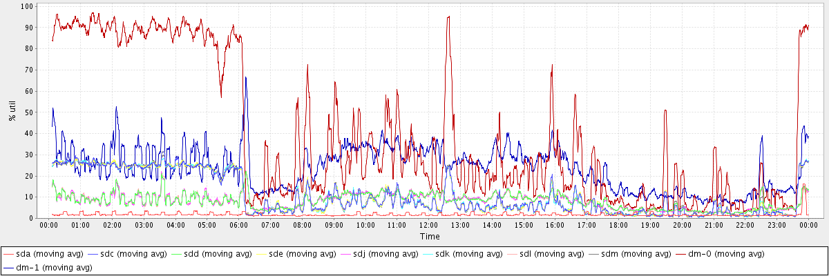 avg(sda) = 1.79 avg(sdc) = 10.74 avg(sdd) = 8.18 avg(sde) = 10.76 avg(sdj) = 8.13 avg(sdk) = 10.74 avg(sdl) = 8.13 avg(sdm) = 10.68 avg(dm-0) = 38.97 avg(dm-1) = 23.67