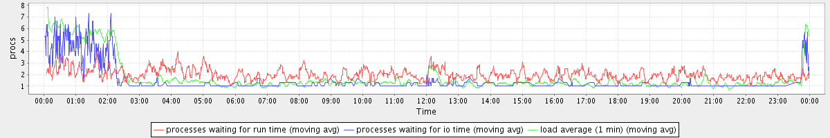 avg(processes waiting for run time) = 1.17 avg(processes waiting for io time) = 0.63 avg(load average (1 min)) = 1.76