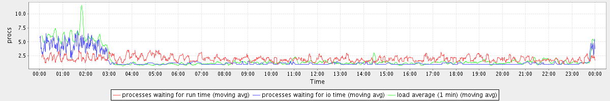 avg(processes waiting for run time) = 1.13 avg(processes waiting for io time) = 0.76 avg(load average (1 min)) = 1.87