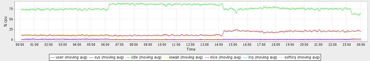 avg(user) = 14.76 avg(sys) = 1.31 avg(idle) = 78.61 avg(iowait) = 4.82 avg(nice) = 0.00 avg(irq) = 0.04 avg(softirq) = 0.46