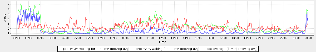 avg(processes waiting for run time) = 1.57 avg(processes waiting for io time) = 0.77 avg(load average (1 min)) = 2.39