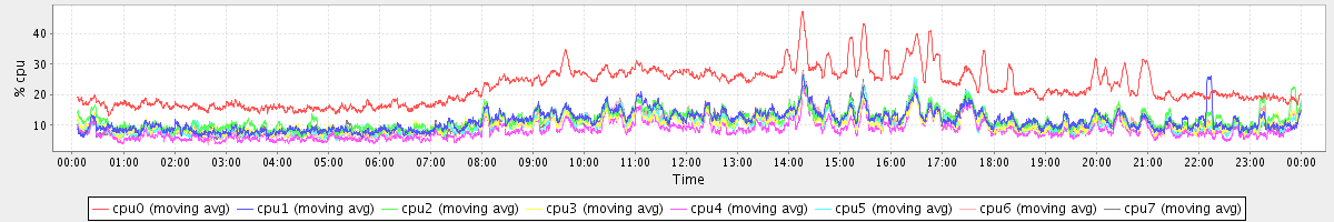 avg(cpu0) = 22.41 avg(cpu1) = 11.45 avg(cpu2) = 11.92 avg(cpu3) = 10.50 avg(cpu4) = 8.37 avg(cpu5) = 10.41 avg(cpu6) = 10.47 avg(cpu7) = 10.71