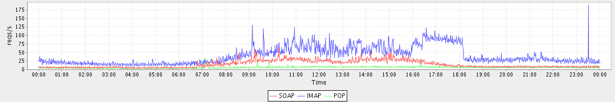 Host zm01.stanford.edu: Mailboxd: Request Rate by Client Protocol