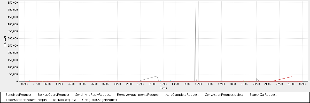 avg(SendMsgRequest) = 253.67 avg(BackupQueryRequest) = 241.75 avg(SendInviteReplyRequest) = 532.88 avg(RemoveAttachmentsRequest) = 445.93 avg(AutoCompleteRequest) = 676.42 avg(ConvActionRequest.delete) = 596.15 avg(SearchGalRequest) = 306.40 avg(FolderActionRequest.empty) = 13510.21 avg(BackupRequest) = 17675.50 avg(GetQuotaUsageRequest) = 1347.00