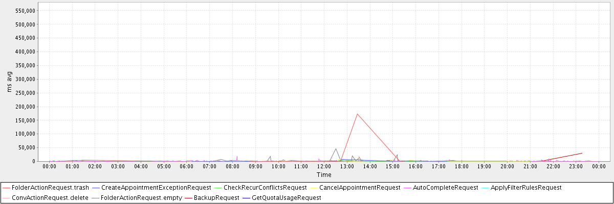 avg(FolderActionRequest.trash) = 24789.43 avg(CreateAppointmentExceptionRequest) = 811.58 avg(CheckRecurConflictsRequest) = 836.75 avg(CancelAppointmentRequest) = 565.78 avg(AutoCompleteRequest) = 755.69 avg(ApplyFilterRulesRequest) = 553942.00 avg(ConvActionRequest.delete) = 616.02 avg(FolderActionRequest.empty) = 2695.68 avg(BackupRequest) = 15066.50 avg(GetQuotaUsageRequest) = 2755.00