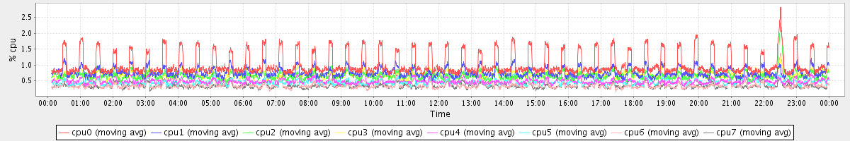 avg(cpu0) = 1.02 avg(cpu1) = 0.76 avg(cpu2) = 0.67 avg(cpu3) = 0.70 avg(cpu4) = 0.50 avg(cpu5) = 0.47 avg(cpu6) = 0.36 avg(cpu7) = 0.35