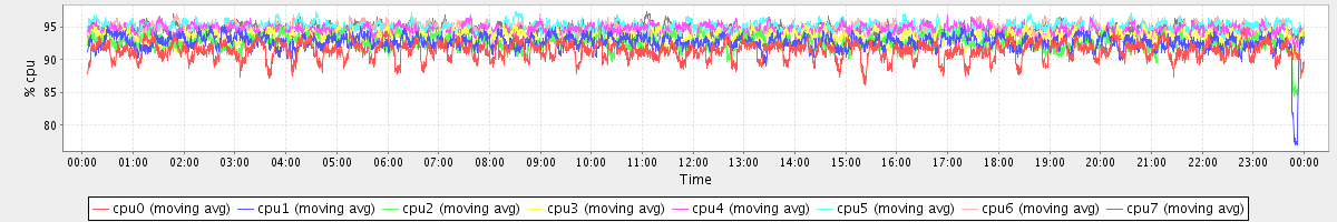 avg(cpu0) = 91.38 avg(cpu1) = 92.64 avg(cpu2) = 92.57 avg(cpu3) = 93.43 avg(cpu4) = 94.50 avg(cpu5) = 94.98 avg(cpu6) = 94.73 avg(cpu7) = 94.49