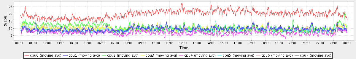 avg(cpu0) = 19.96 avg(cpu1) = 9.49 avg(cpu2) = 10.80 avg(cpu3) = 10.04 avg(cpu4) = 6.98 avg(cpu5) = 9.21 avg(cpu6) = 9.67 avg(cpu7) = 8.57