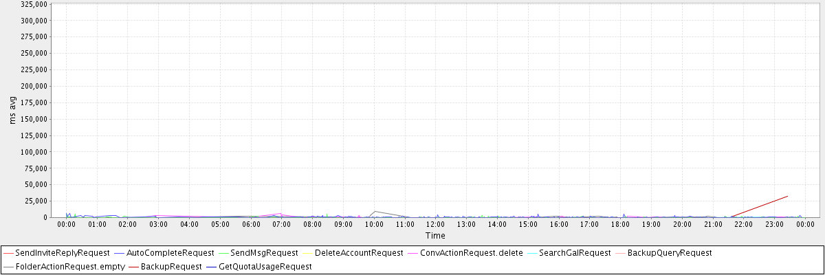 avg(SendInviteReplyRequest) = 1035.00 avg(AutoCompleteRequest) = 592.22 avg(SendMsgRequest) = 255.37 avg(DeleteAccountRequest) = 311561.00 avg(ConvActionRequest.delete) = 741.88 avg(SearchGalRequest) = 297.33 avg(BackupQueryRequest) = 274.25 avg(FolderActionRequest.empty) = 1108.33 avg(BackupRequest) = 16486.50 avg(GetQuotaUsageRequest) = 1985.00