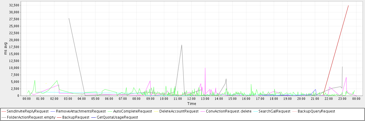 avg(SendInviteReplyRequest) = 927.00 avg(RemoveAttachmentsRequest) = 449.25 avg(AutoCompleteRequest) = 647.97 avg(DeleteAccountRequest) = 4378.00 avg(ConvActionRequest.delete) = 1076.64 avg(SearchGalRequest) = 385.00 avg(BackupQueryRequest) = 375.50 avg(FolderActionRequest.empty) = 2705.91 avg(BackupRequest) = 16333.50 avg(GetQuotaUsageRequest) = 1755.00
