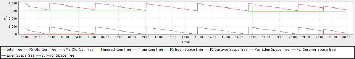 avg(total free) = 3510.25 avg(PS Old Gen free) = 0.00 avg(CMS Old Gen free) = 2998.39 avg(Tenured Gen free) = 0.00 avg(Train Gen free) = 0.00 avg(PS Eden Space free) = 0.00 avg(PS Survivor Space free) = 0.00 avg(Par Eden Space free) = 469.02 avg(Par Survivor Space free) = 42.83 avg(Eden Space free) = 0.00 avg(Survivor Space free) = 0.00