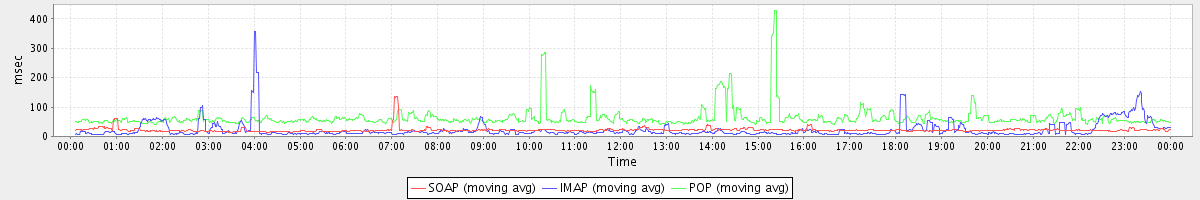 max(SearchRequest) = 53.00 max(MsgActionRequest.delete) = 46.00 max(NoOpRequest) = 53.00 max(MsgActionRequest.trash) = 31.00 max(GetMsgRequest) = 30.00 max(SearchConvRequest) = 36.00 max(GetFolderRequest) = 311.00 max(SyncRequest) = 318.00 max(GetEffectiveFolderPermsRequest) = 60.00 max(GetAppointmentRequest) = 693.00