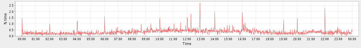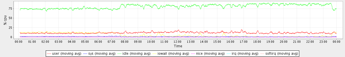 avg(user) = 11.47 avg(sys) = 1.42 avg(idle) = 80.80 avg(iowait) = 5.83 avg(nice) = 0.00 avg(irq) = 0.04 avg(softirq) = 0.45