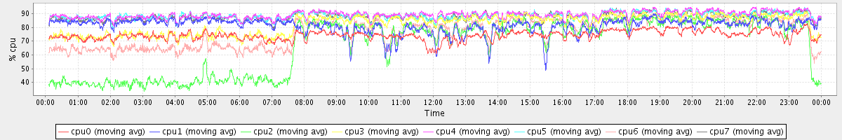 avg(cpu0) = 74.26 avg(cpu1) = 81.23 avg(cpu2) = 66.90 avg(cpu3) = 82.41 avg(cpu4) = 89.17 avg(cpu5) = 88.40 avg(cpu6) = 76.25 avg(cpu7) = 87.78