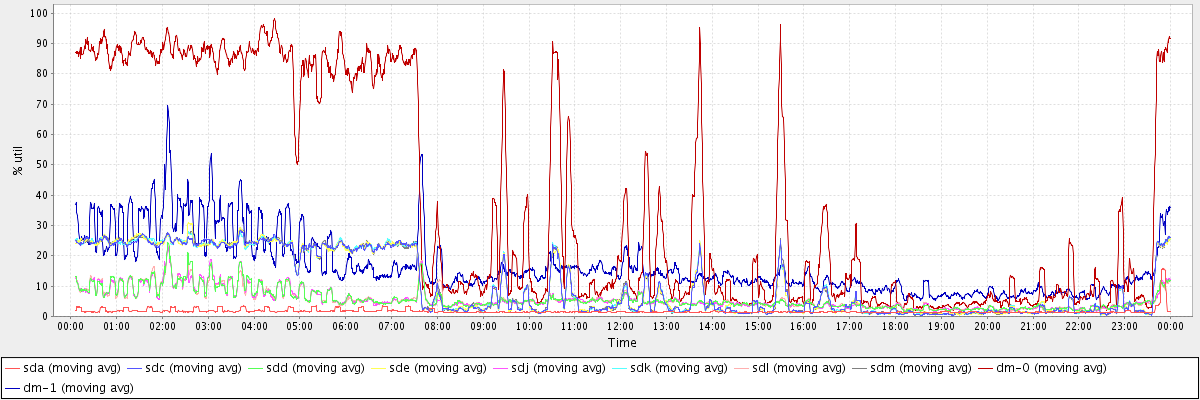 avg(sda) = 1.70 avg(sdc) = 10.36 avg(sdd) = 5.66 avg(sde) = 10.40 avg(sdj) = 5.63 avg(sdk) = 10.40 avg(sdl) = 5.66 avg(sdm) = 10.43 avg(dm-0) = 37.84 avg(dm-1) = 16.63