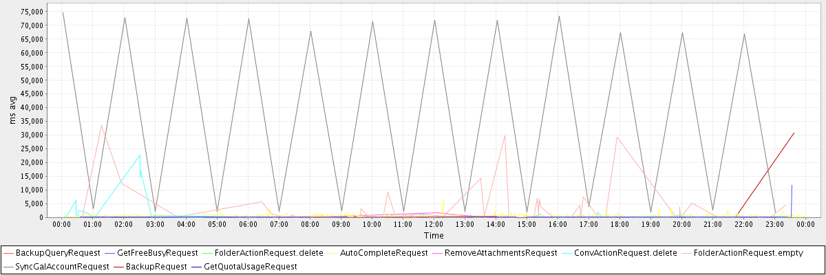 avg(BackupQueryRequest) = 249.75 avg(GetFreeBusyRequest) = 422.02 avg(FolderActionRequest.delete) = 357.00 avg(AutoCompleteRequest) = 479.60 avg(RemoveAttachmentsRequest) = 397.78 avg(ConvActionRequest.delete) = 680.53 avg(FolderActionRequest.empty) = 3222.00 avg(SyncGalAccountRequest) = 36694.50 avg(BackupRequest) = 15591.00 avg(GetQuotaUsageRequest) = 1322.00