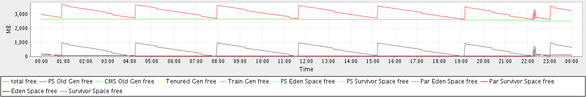 avg(total free) = 3117.20 avg(PS Old Gen free) = 0.00 avg(CMS Old Gen free) = 2603.33 avg(Tenured Gen free) = 0.00 avg(Train Gen free) = 0.00 avg(PS Eden Space free) = 0.00 avg(PS Survivor Space free) = 0.00 avg(Par Eden Space free) = 468.62 avg(Par Survivor Space free) = 45.25 avg(Eden Space free) = 0.00 avg(Survivor Space free) = 0.00