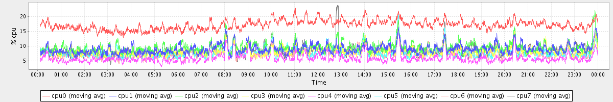 avg(cpu0) = 17.19 avg(cpu1) = 9.04 avg(cpu2) = 9.57 avg(cpu3) = 8.41 avg(cpu4) = 6.06 avg(cpu5) = 8.02 avg(cpu6) = 7.68 avg(cpu7) = 8.40
