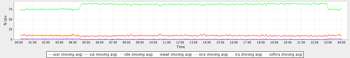 avg(user) = 9.68 avg(sys) = 1.16 avg(idle) = 84.99 avg(iowait) = 3.82 avg(nice) = 0.00 avg(irq) = 0.02 avg(softirq) = 0.33