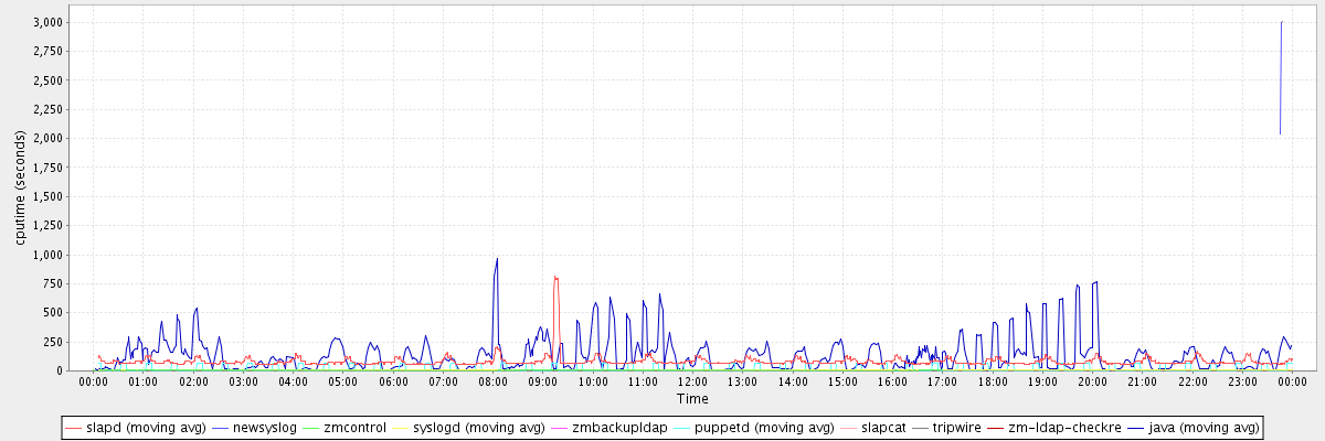 avg(slapd) = 82.32 avg(newsyslog) = 2521.50 avg(zmcontrol) = 4.63 avg(syslogd) = 6.09 avg(zmbackupldap) = 5.00 avg(puppetd) = 14.87 avg(slapcat) = 257.00 avg(tripwire) = 3001.50 avg(zm-ldap-checkre) = 5.00 avg(java) = 134.63