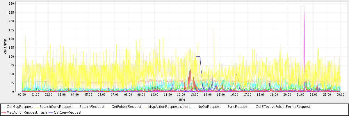 max(GetMsgRequest) = 63.00 max(SearchConvRequest) = 45.00 max(SearchRequest) = 51.00 max(GetFolderRequest) = 182.00 max(MsgActionRequest.delete) = 245.00 max(NoOpRequest) = 45.00 max(SyncRequest) = 39.00 max(GetEffectiveFolderPermsRequest) = 48.00 max(MsgActionRequest.trash) = 61.00 max(GetConvRequest) = 100.00