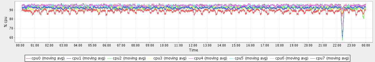 avg(cpu0) = 88.77 avg(cpu1) = 92.12 avg(cpu2) = 92.17 avg(cpu3) = 92.20 avg(cpu4) = 94.62 avg(cpu5) = 94.38 avg(cpu6) = 94.71 avg(cpu7) = 94.86