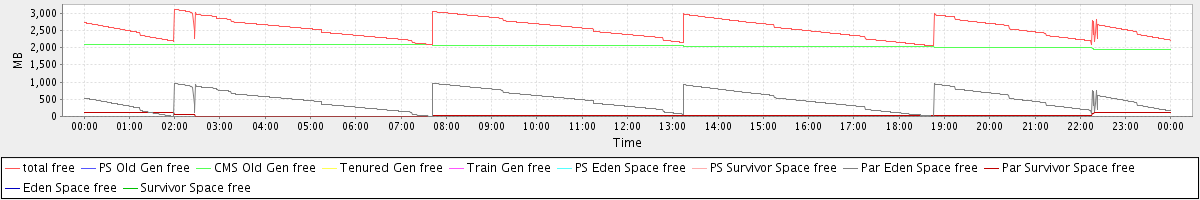 avg(total free) = 2540.99 avg(PS Old Gen free) = 0.00 avg(CMS Old Gen free) = 2037.62 avg(Tenured Gen free) = 0.00 avg(Train Gen free) = 0.00 avg(PS Eden Space free) = 0.00 avg(PS Survivor Space free) = 0.00 avg(Par Eden Space free) = 468.53 avg(Par Survivor Space free) = 34.84 avg(Eden Space free) = 0.00 avg(Survivor Space free) = 0.00