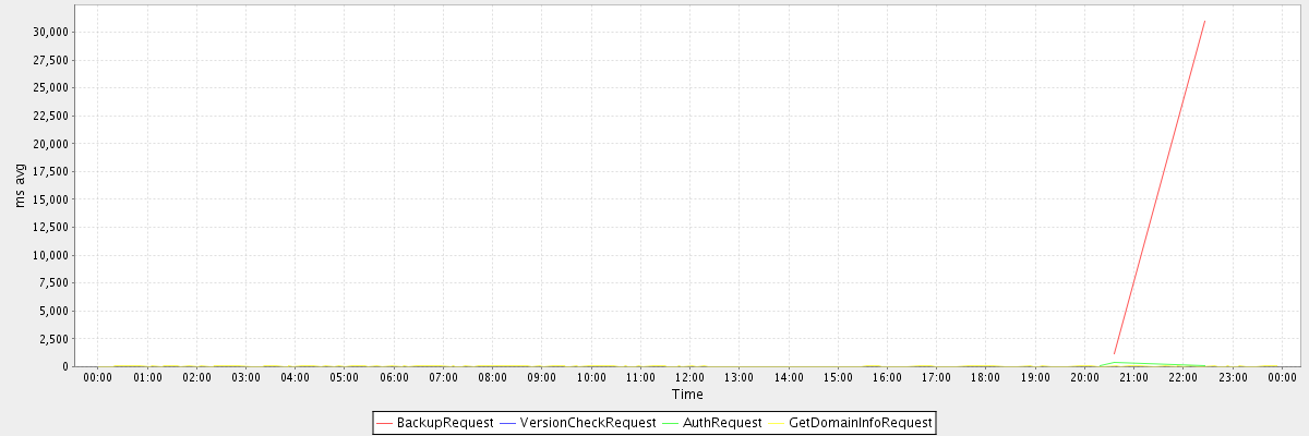 avg(BackupRequest) = 16071.50 avg(VersionCheckRequest) = 590.00 avg(AuthRequest) = 159.00 avg(GetDomainInfoRequest) = 6.30