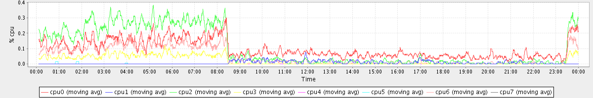 avg(cpu0) = 0.10 avg(cpu1) = 0.01 avg(cpu2) = 0.11 avg(cpu3) = 0.02 avg(cpu4) = 0.00 avg(cpu5) = 0.00 avg(cpu6) = 0.05 avg(cpu7) = 0.00
