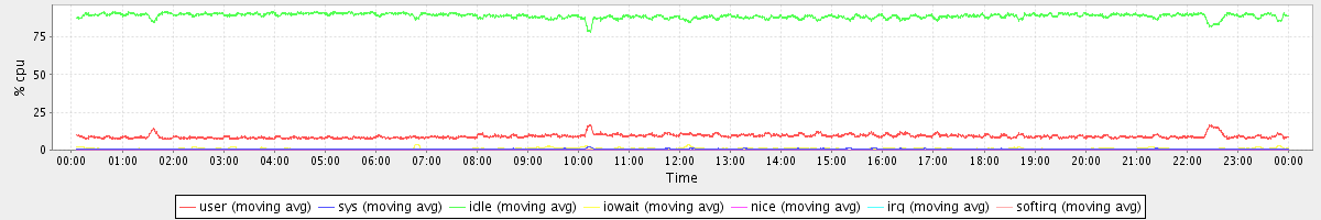 avg(user) = 9.14 avg(sys) = 0.79 avg(idle) = 88.90 avg(iowait) = 1.01 avg(nice) = 0.00 avg(irq) = 0.00 avg(softirq) = 0.16