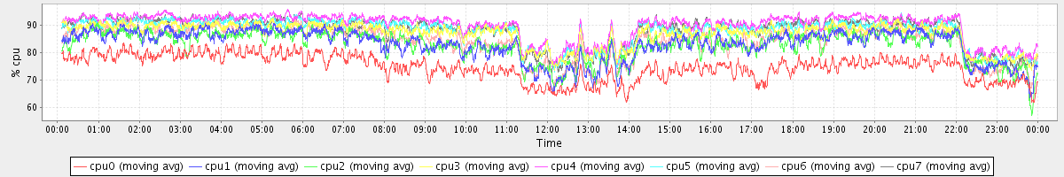 avg(cpu0) = 22.17 avg(cpu1) = 12.01 avg(cpu2) = 11.69 avg(cpu3) = 11.63 avg(cpu4) = 8.95 avg(cpu5) = 10.85 avg(cpu6) = 11.79 avg(cpu7) = 10.75