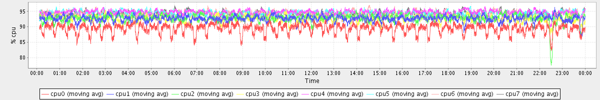 avg(cpu0) = 89.44 avg(cpu1) = 92.71 avg(cpu2) = 92.82 avg(cpu3) = 92.63 avg(cpu4) = 94.61 avg(cpu5) = 94.31 avg(cpu6) = 94.20 avg(cpu7) = 94.13