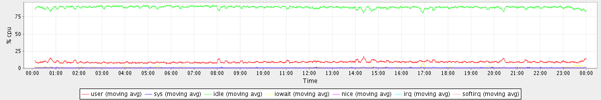 avg(user) = 9.04 avg(sys) = 0.80 avg(idle) = 88.95 avg(iowait) = 1.06 avg(nice) = 0.00 avg(irq) = 0.00 avg(softirq) = 0.14