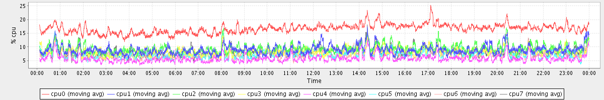 avg(cpu0) = 16.69 avg(cpu1) = 8.92 avg(cpu2) = 9.39 avg(cpu3) = 8.45 avg(cpu4) = 5.77 avg(cpu5) = 7.70 avg(cpu6) = 7.36 avg(cpu7) = 7.99