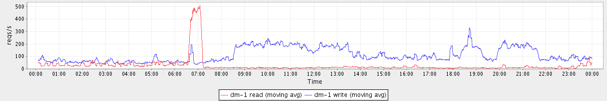 avg(dm-1 read) = 28.58 avg(dm-1 write) = 110.82