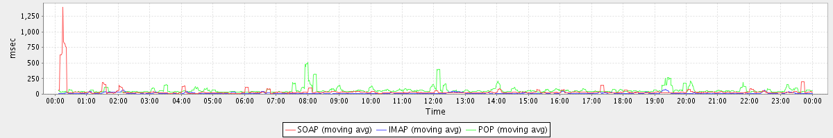 avg(SendInviteReplyRequest) = 396.00 avg(AutoCompleteRequest) = 512.06 avg(DeleteAccountRequest) = 23770.50 avg(ConvActionRequest.delete) = 238.02 avg(SearchGalRequest) = 278.59 avg(FolderActionRequest.empty) = 4126.61 avg(BrowseRequest) = 834.00 avg(SyncGalAccountRequest) = 87430.96 avg(BackupRequest) = 88884.50 avg(GetQuotaUsageRequest) = 1274.00