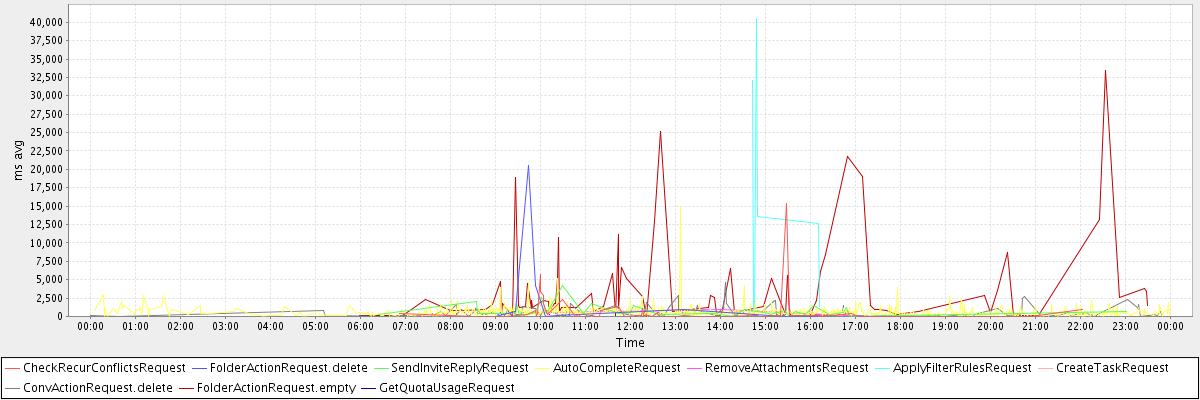 avg(CheckRecurConflictsRequest) = 601.65 avg(FolderActionRequest.delete) = 2652.20 avg(SendInviteReplyRequest) = 741.37 avg(AutoCompleteRequest) = 613.90 avg(RemoveAttachmentsRequest) = 514.75 avg(ApplyFilterRulesRequest) = 12825.75 avg(CreateTaskRequest) = 956.00 avg(ConvActionRequest.delete) = 513.63 avg(FolderActionRequest.empty) = 3652.78 avg(GetQuotaUsageRequest) = 2410.00