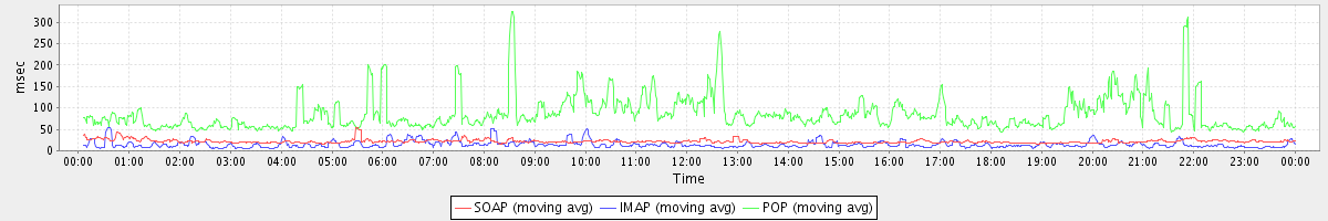 avg(ImportAppointmentsRequest) = 707.00 avg(DeleteAccountRequest) = 3638.00 avg(SendInviteReplyRequest) = 665.40 avg(AutoCompleteRequest) = 684.77 avg(RemoveAttachmentsRequest) = 755.67 avg(ApplyFilterRulesRequest) = 295522.00 avg(ConvActionRequest.delete) = 814.60 avg(FolderActionRequest.empty) = 4700.60 avg(BackupRequest) = 16459.00 avg(GetQuotaUsageRequest) = 1505.00
