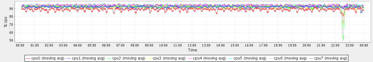 avg(cpu0) = 89.08 avg(cpu1) = 92.41 avg(cpu2) = 92.35 avg(cpu3) = 92.43 avg(cpu4) = 94.29 avg(cpu5) = 94.07 avg(cpu6) = 93.77 avg(cpu7) = 93.96