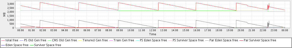 avg(total free) = 2670.15 avg(PS Old Gen free) = 0.00 avg(CMS Old Gen free) = 2155.63 avg(Tenured Gen free) = 0.00 avg(Train Gen free) = 0.00 avg(PS Eden Space free) = 0.00 avg(PS Survivor Space free) = 0.00 avg(Par Eden Space free) = 457.30 avg(Par Survivor Space free) = 57.21 avg(Eden Space free) = 0.00 avg(Survivor Space free) = 0.00
