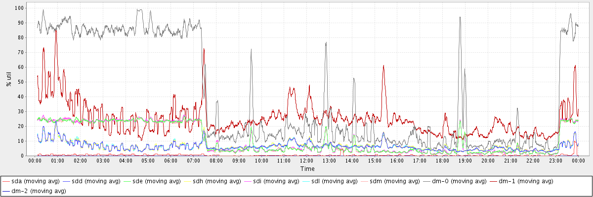 avg(sda) = 0.47 avg(sdd) = 6.41 avg(sde) = 10.83 avg(sdh) = 6.54 avg(sdi) = 10.91 avg(sdl) = 6.42 avg(sdm) = 10.77 avg(dm-0) = 39.58 avg(dm-1) = 25.13 avg(dm-2) = 0.00