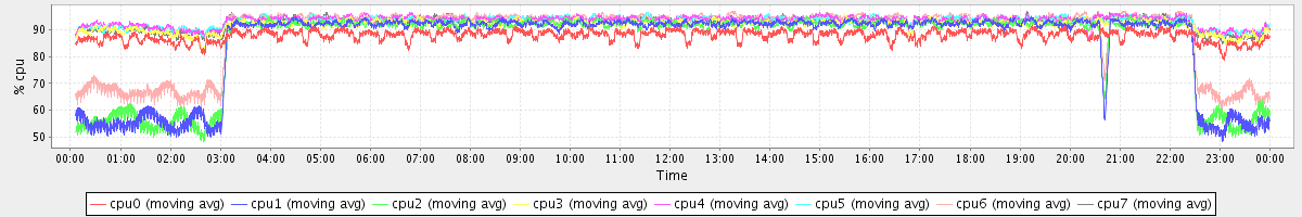 avg(cpu0) = 87.81 avg(cpu1) = 85.07 avg(cpu2) = 85.05 avg(cpu3) = 91.74 avg(cpu4) = 93.32 avg(cpu5) = 93.12 avg(cpu6) = 89.12 avg(cpu7) = 92.77