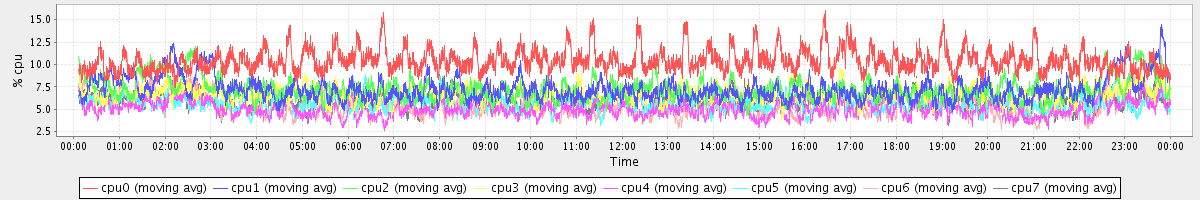 avg(cpu0) = 10.41 avg(cpu1) = 7.26 avg(cpu2) = 7.29 avg(cpu3) = 6.74 avg(cpu4) = 5.01 avg(cpu5) = 5.67 avg(cpu6) = 5.41 avg(cpu7) = 5.96